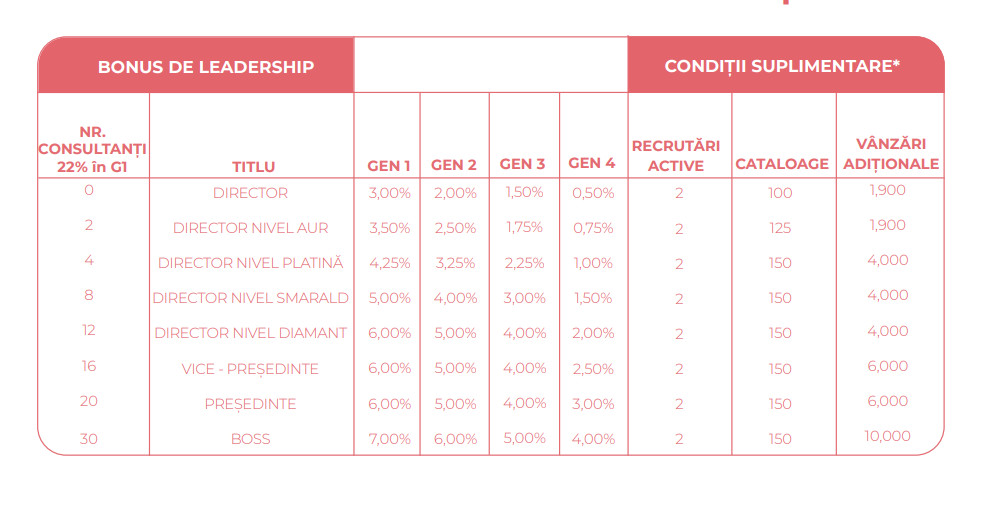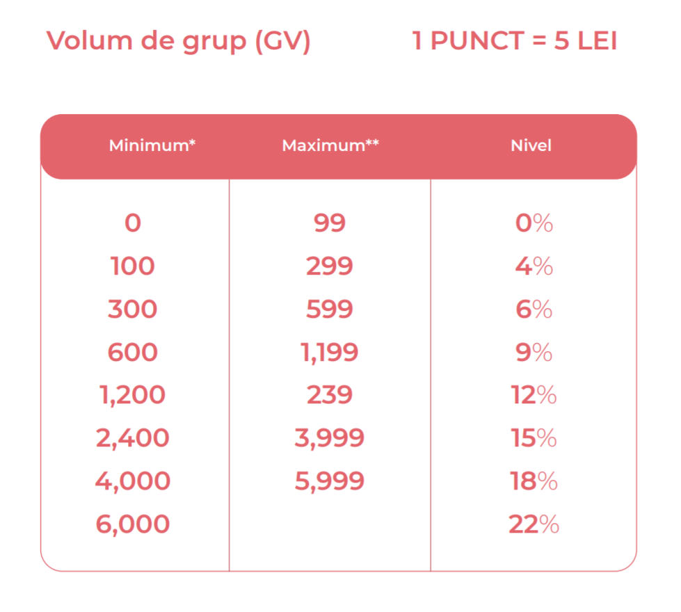 De exemplu, să presupunem că primeşti nivelul de bonus 22% şi persoana recrutată de tine, Emily, primeşte nivelul de bonus 15%. Bonusul de grup pe care îl câştigi de la Emily se calcuelază înmulţind volumul de grup al lui Emily cu diferenţa dintre nivelul tău de bonus şi nivelul de bonul al lui Emily. În acest caz (22% – 15%)x Volumul de grup al lui Emily = Bonusul tău de grup de la Emily.